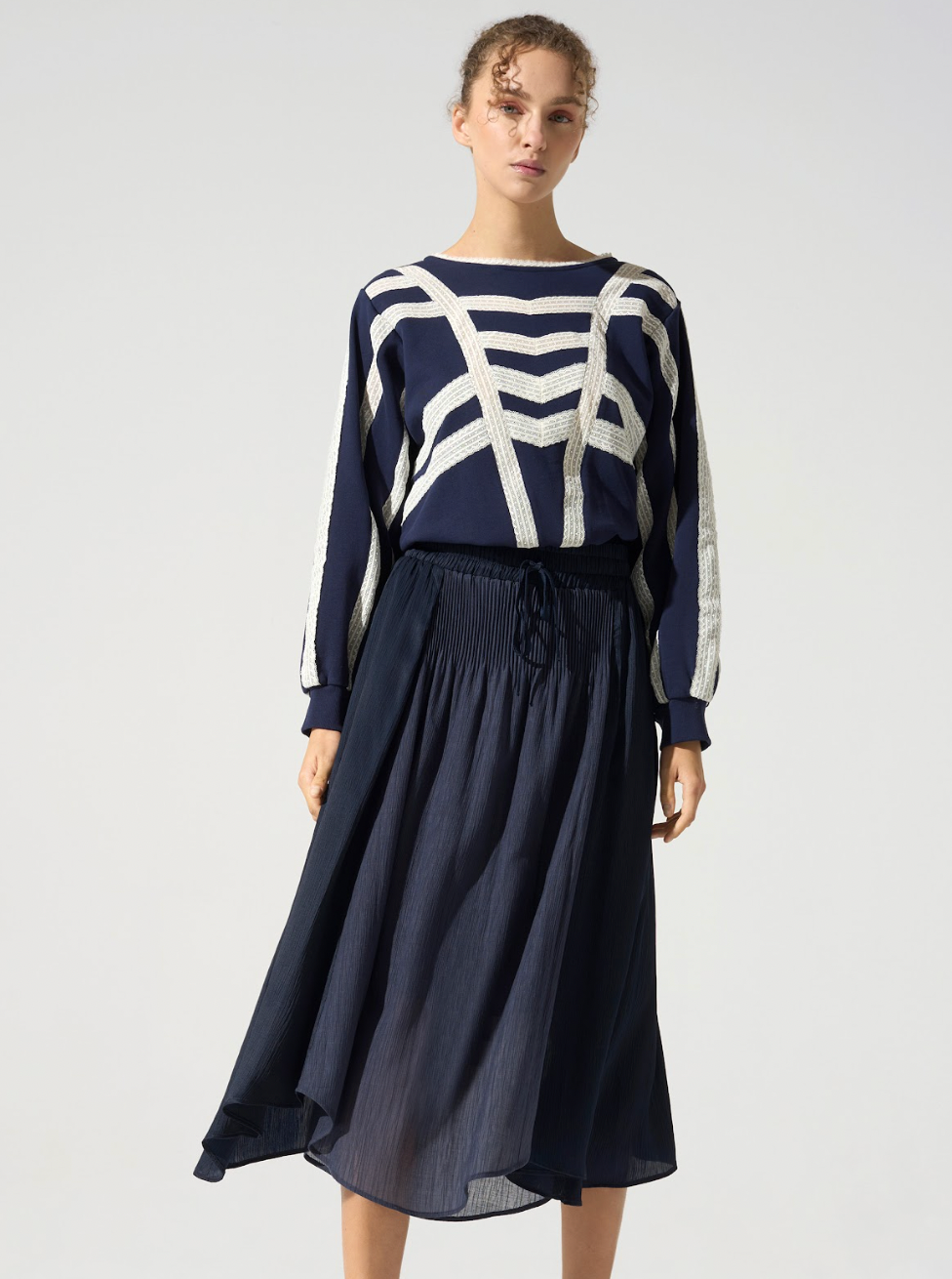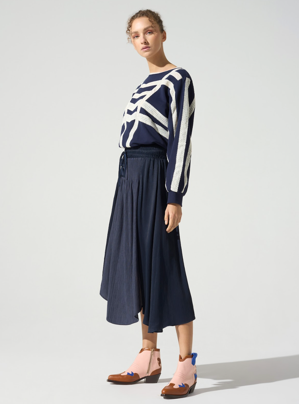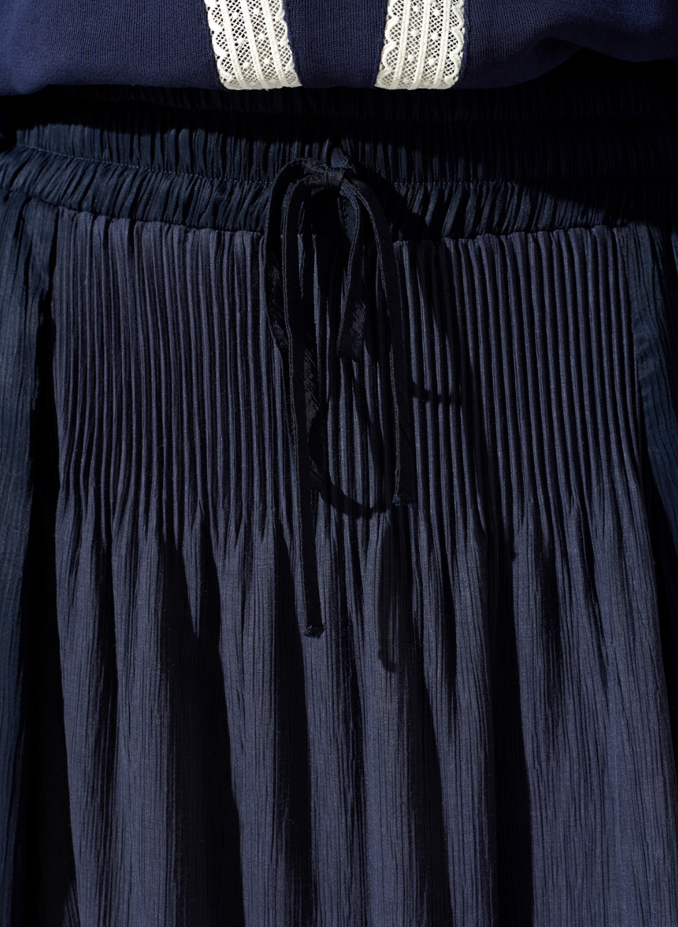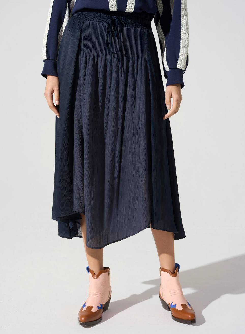 Regular price $350.00 Sale price $140.00 Save $210.00This fluid, vibrant skirt is made to move, featuring an elasticated waist with tie detail, an irregular hem, and intricate pleated panels that drape down from the waist. The lightweight design is made from cupro, with a subtle sheen and elegant shape, and polyester, for its ability to hold pleats over time. The full viscose lining adds to the comfort of the piece, while the easy-care fabric makes this a practical choice. The pleated details are created in our workshops in Ambérieu-en-Bugey, France, using signature Cotélac artisan techniques. A blend of tradition and innovation, made for modern life.