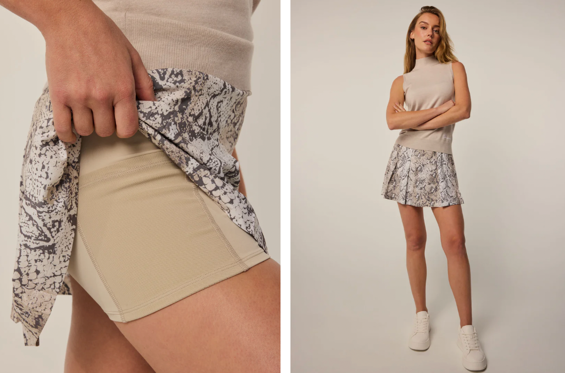 Crafted from a luxurious fabric and featuring a pleated design, the Wolf Scales Ashe Skirt is a quintessential piece that can move beyond the court. Designed with plenty of stretch so you can move freely through the day. Decorated with a signature pattern throughout. This athletic skirt is finished with an internal shortie and pockets at the hips to store tennis balls and other valuables.